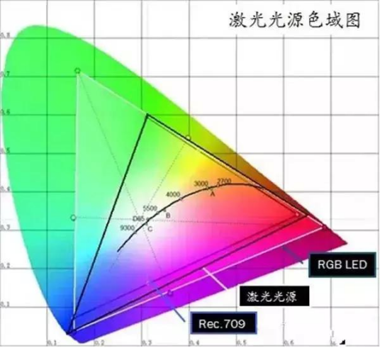就目前市场中,绝大部分光源占比还是成熟的三色LED光源,它具有寿命长、色域广的特点;三色激光光源会运用在影院等商用场景,但消费级市场的激光投影机还是单色激光为主。特别是单色激光具有先天的低色域缺陷,而且色彩的准确性就没有那么理想。这样一来,身为三原色的LED光源的优势就凸显出来了—— 三色RGB LED光源色域要高于激光光源。